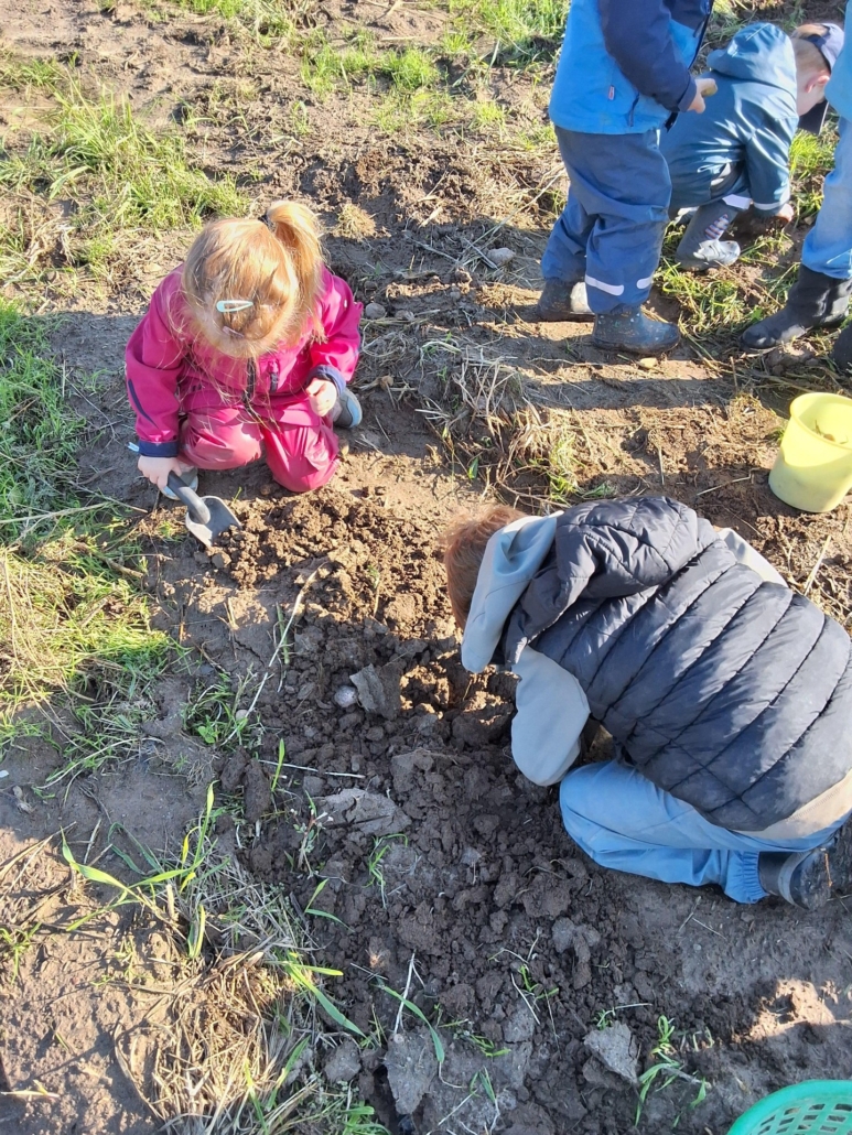 Bevor es ans Graben ging, erklärte uns Frau Wagner auf liebevolle Weise, wie aus kleinen Kartoffelknollen die leckeren, runden Schätze wachsen. Die Kinder staunten, dass unter der Erde die ganze „Knollenfamilie“ verborgen liegt, die wir nun entdecken durften.